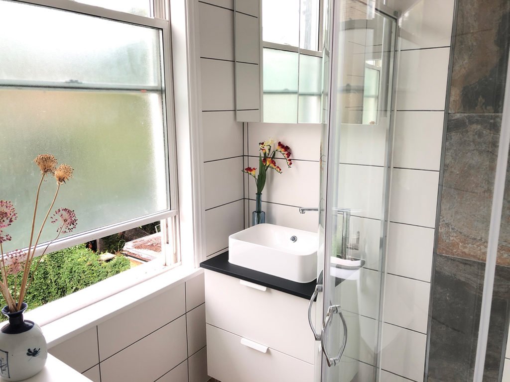 Bathroom: New contemporary bathroom with shower & hand basin. Heated towel rail & washing machine. Separate toilet.