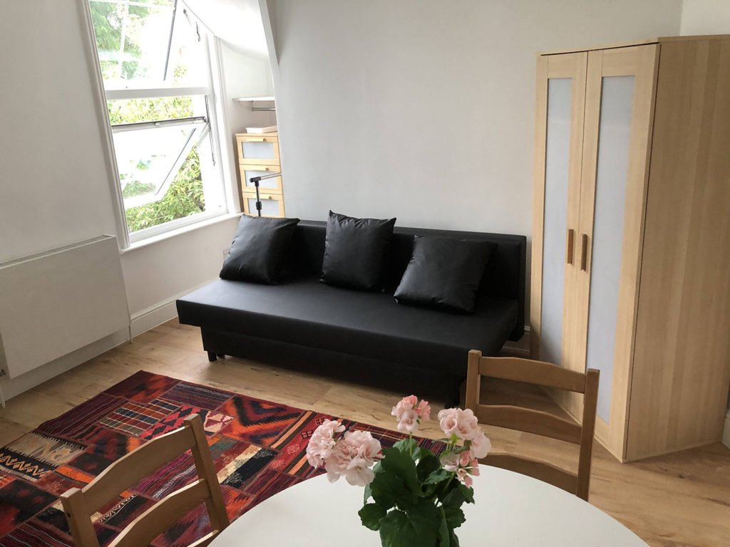 Main area: A cozy single floor studio flat on 2nd floor with main front room with comfortable furnishings with plenty of bookshelf space. Sofa bed (very easy to expand to a bed), dining table and chairs. Scandinavian oak wooden flooring. Clothes cupboard. chest of drawers and storage space under stairs and above hall area.