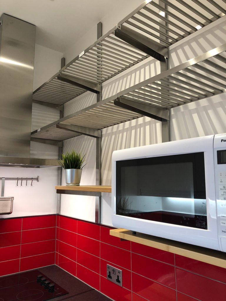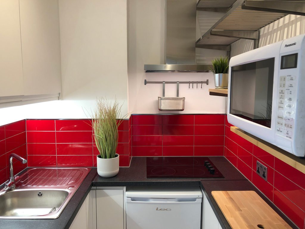 Kitchen: Stunning, compact and cleverly designed kitchen with fridge, hob & combination microwave oven. Ample cupboard and shelf space.