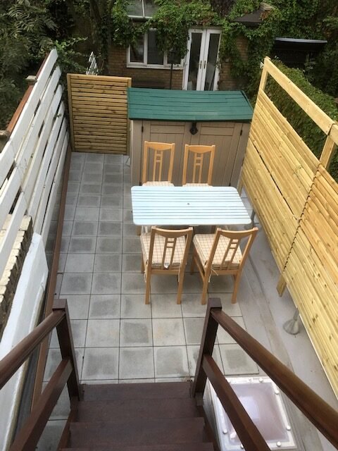 Roof deck: Access to the roof deck is by fire escape door (over the rear extension of Flat A), shared with flat B. In summer, this is a quiet area for reading or enjoying a meal outside (no BBQs allowed due to fire risk).